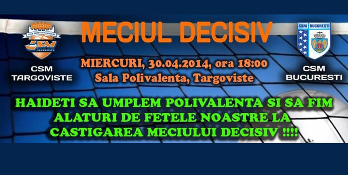Miercuri 30 aprilie 2014 va astepta la Sala Sporturilor din Targoviste cu incepere de la orele 18 pentru a sustine echipa locala de volei CSM Targoviste.